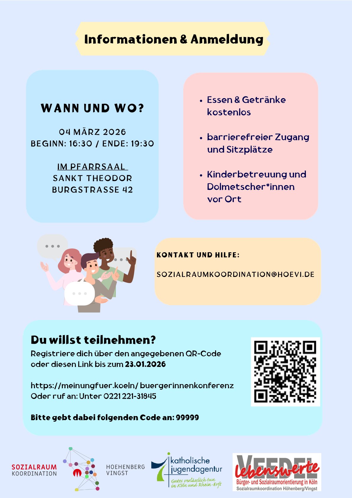 Wenn Sie Teil der Bürger*innenkonferenz sein möchten, registrieren Sie sich bitte online bis zum 23.01.2026 unter https://meinungfuer.koeln/buergerinnenkonferenz